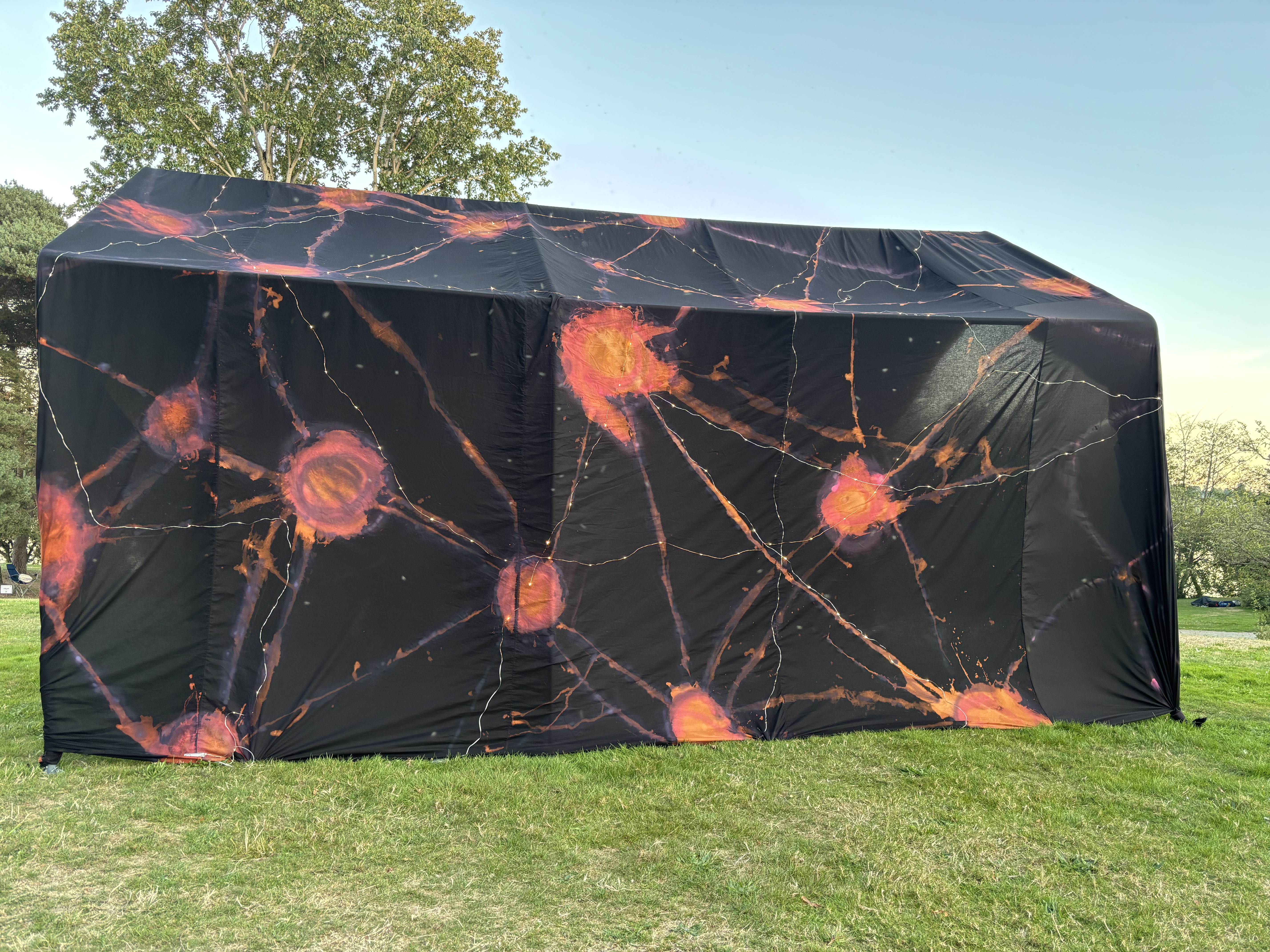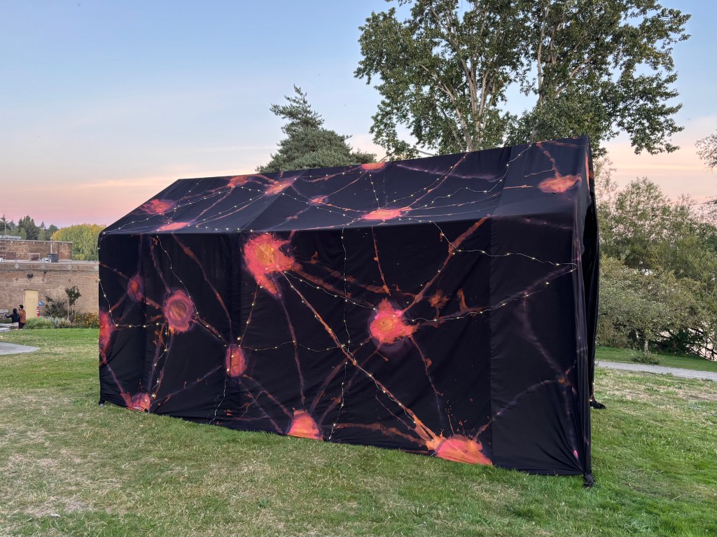 A Small Light in a Dark Room is a sculpture commissioned by the Fremont Arts Council for the 2024 public art festival, Luminata. The work is 10′ H x 10′ W x 20′ L fabricated with cotton textile, steel, and holiday lights. The piece is inspired by Miep Gies, the Dutch citizen who hid Anne Frank and her family from Nazi capture for two years. Of her remarkable courage she said, “I did what I had to do because it was the right thing to do, that is all. We are all ordinary people, but even an ordinary secretary or a housewife or a teenager can– within their own small ways – turn on a small light in a dark room.”